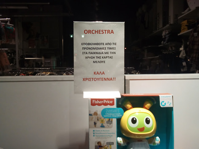 Ίσως το μεγαλύτερο κατάστημα Orchestra. Πολύ μεγάλη ποικιλία σε ρούχα κάθε ηλικίας καθώς επίσης και σε είδη βρεφανάπτυξης, καροτσάκια, καθίσματα αυτοκινήτου. Ρούχα υπάρχουν πολλά για όλες τις ηλικίες. Βρίσκεις σχέδια που δεν υπάρχουν σε άλλα καταστήματα. Στα συν το ότι διαθέτει ένα μικρό παιδότοπο για να απολογηθούν τα παιδιά και επίσης το ότι διαθέτει και πάρκινγκ. Στα μείον το μαζεύει πολύ κόσμο και συνήθως εξυπηρετούν 2 κοπέλες οπότε σχηματίζεται μεγάλη ουρά και θέλει λίγο υπομονή.